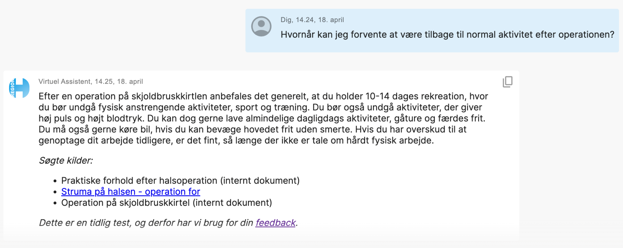 En bruger spørger: Hvornår kan jeg forvente at være tilbage på normalt aktivitetsniveau efter operationen?