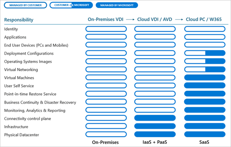 Management of on-premises VDI, Azure Virtual Desktop, and Windows 365 differ regarding roles and responsibilities as shown in the table below. Some of the responsibilities that are unique capabilities for Windows 365 are managed by Microsoft, so if you’re looking for a solution that’s optimized for simplicity and user experience, consider Windows 365 today!