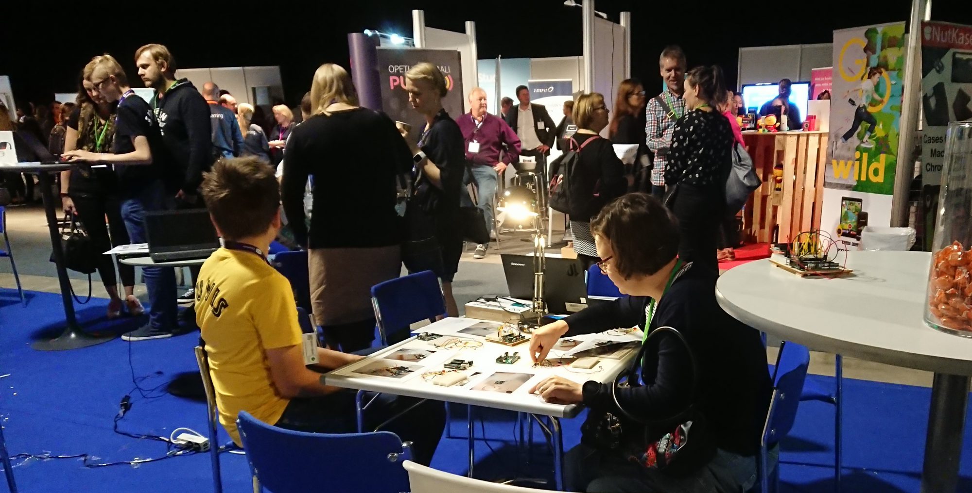 Eräs näytteilleasettajista oli sopinut, että espoolaisen Juvanpuiston koulun kasiluokkalaiset pitäisivät osastollaan työpajoja, joissa he opettaisivat halukkaita säveltämään micro:bit Makecodella musiikkia, rakentamaan Arduinolla kytkentöjä ja testaamaan 3D-skannausta Paint 3D:n ja HP Sproutin avulla. Tarkoitus oli näyttää, kuinka tämä espoolainen koulu oli kytkenyt tieteen ja taiteen perusopetuksessa yhteen.