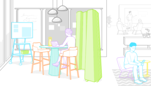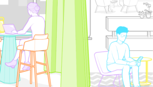 ”Luo pari-kolme mallia tilan järjestyksestä erilaista vuorovaikutusta varten – yksi etänä työskentelevää tiimiä, yksi brainstorming-hetkeä varten, ja niin edelleen”, Messer sanoo. Apuna voi käyttää tarroja ja julisteita, joissa on esimerkkejä eri järjestyksistä tai jotka osoittavat siirreltävät kalusteet.