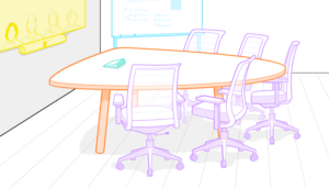 Myös pöydän muotoon on syytä kiinnittää huomiota. Kitaraplektran muotoiset pöydät sopivat hyvin hybridinä tapahtuvaan yhteistyöhön. Huoneessa olevat voivat kokoontua sujuvasti pöydän ympärille ja istua silti kasvot kameran ja näytön suuntaan nähden etäosallistujat. ”Huoneessa olevien vuorovaikutus etäosallistujiin on luontevaa, mutta he istuvat myös sopivassa asetelmassa toisiinsa nähden”, Messer sanoo.