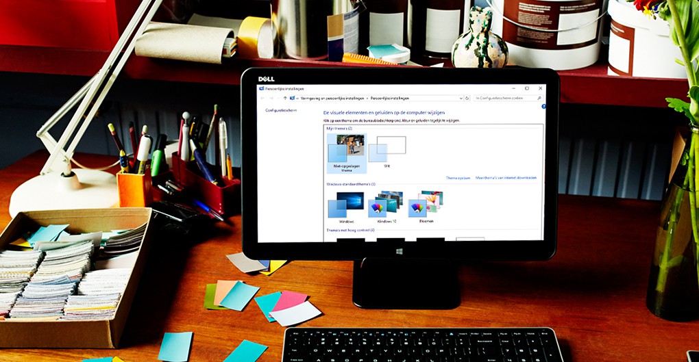 Avec un thème, vous modifiez simultanément l’arrière-plan du bureau, la couleur et les sons. Très pratique ! Cliquez dans la fenêtre ‘Paramètres personnels’ sur ‘Thèmes’, ‘Paramètres du thème’. Une nouvelle fenêtre apparaît avec tous les thèmes disponibles. Cliquez sur un exemplaire qui vous plaît et notez que l’apparence de Windows 10 change immédiatement. Par le biais de ‘Obtenir plus de thèmes en ligne’ vous pouvez télécharger sans engagement un thème d’Internet.