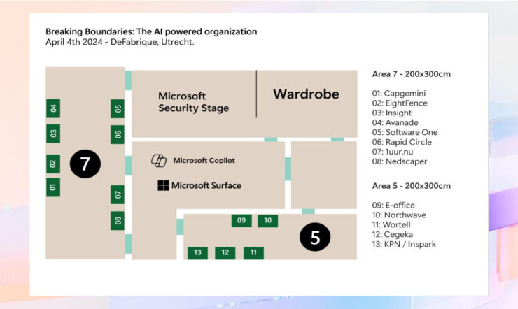 Meet and discover solutions from Microsoft's featured partners on Microsoft 365 Copilot and Security Copilot at their booths on the event expo. 1uur.nu, Avanade, Capgemini, Cegeka, EightFence, e-office, Insight, KPN / Inspark, Nedscaper, Northwave, Rapid Circle, Software One, Wortell