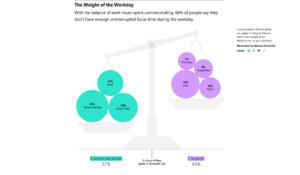 Een eerste trend: het communicatieverkeer neemt toe. In 2022 besteden we meer dan helft onze dag aan e-mails, team meetings en chat. Daartegenover besteden we gemiddeld 40% nog maar aan gefocust werk. Een derde van de werknemers denkt dat ze niet gemist zouden worden bij het merendeel van hun meetings. Bijna driekwart (63%) van de werknemers zegt niet genoeg tijd te hebben om zich te focussen door een overload aan informatie.